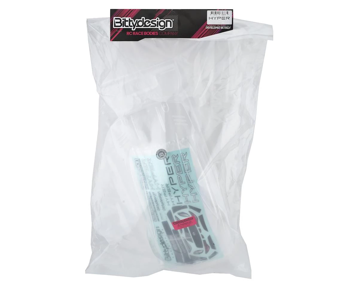 This is a Bittydesign 190mm Ultra Lightweight HYPER Touring Car Body. The HYPER project was born from the necessity to offer enthusiasts a high-performance low center gravity body that could meet at best the new market needs of this category; we have worked extensively for several months trying to combine innovative forms in the best way while not neglecting the aesthetics that recalls the design of the real car that inspired our design.
