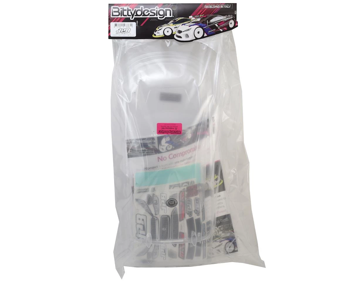 This is the optional “Lightweight” Bittydesign 190mm JP8 1/10 Touring Car Body in Clear Lexan. The JP8 includes all of the Bittydesign experience gained in over 10 years of presence on the racetrack, with the final version the result of may requested changes to reach the perfect shape. The result: an ultra downforce design to generate impressive steering as well an excellent rear stability; very easy to push the car at limit, the driving feeling is great both on indoor and outdoors layouts.
