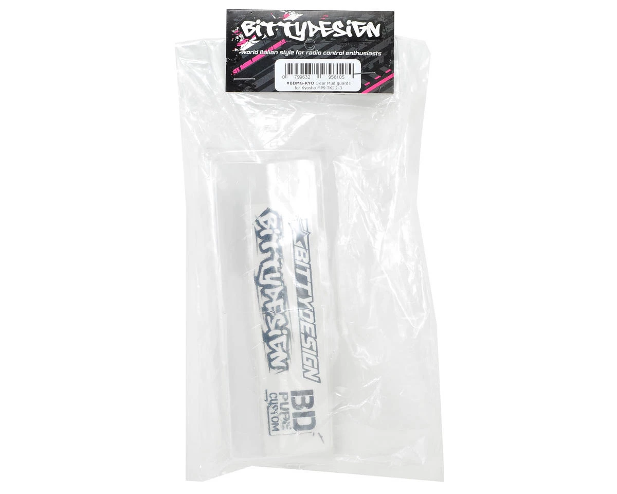 This is a pack of Bittydesign Kyosho MP9 Mud Guards. These mud guards have been developed specifically for the Kyosho MP9 family of 1/8 buggies, providing a perfect fit that will help protect the rear driveshafts and shock components from dirt and other contaminants. Plus, they are molded from crystal clear polycarbonate, so they can be painted to match your paint scheme! Simply paint and install on the rear suspension arms to improve the visual appeal of your rig.