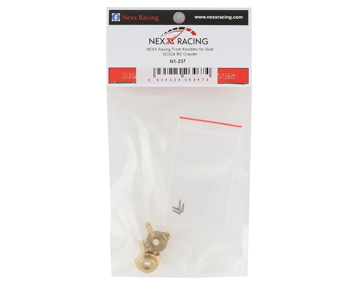 NEXX Racing Axial SCX24 Brass Front Knuckles. These optional front knuckles are made from precision machined brass and are made to lower the CG of the Axial SCX24. Using these will also lead to an increase in stability. Package includes two front knuckles and hardware.