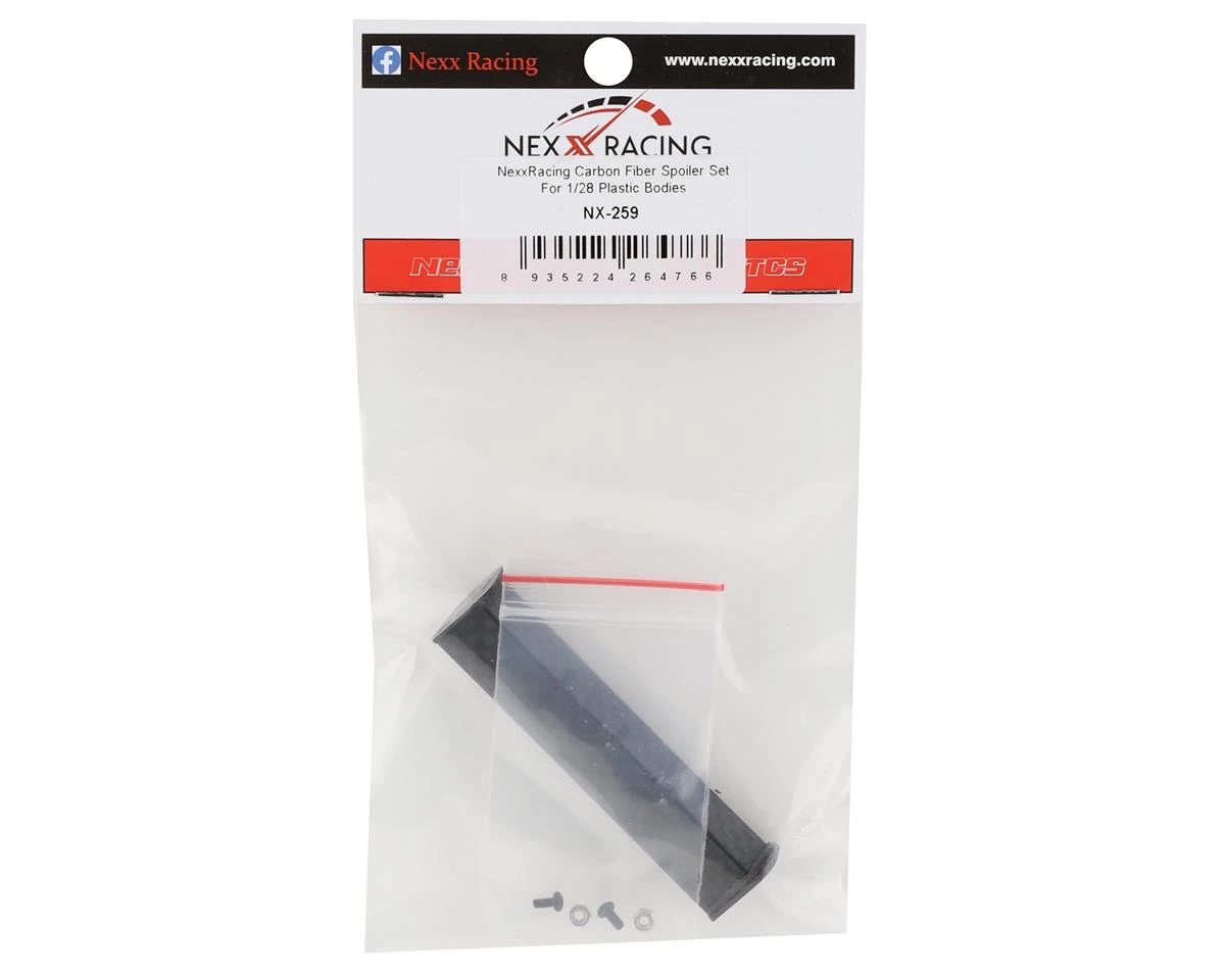 This optional Nexx Racing Carbon Fiber Spoiler Set for Mini-Z or other 1/28 scale bodies adds great detail and realism to any body you have mounted to your race chassis. Includes mounting hardware.