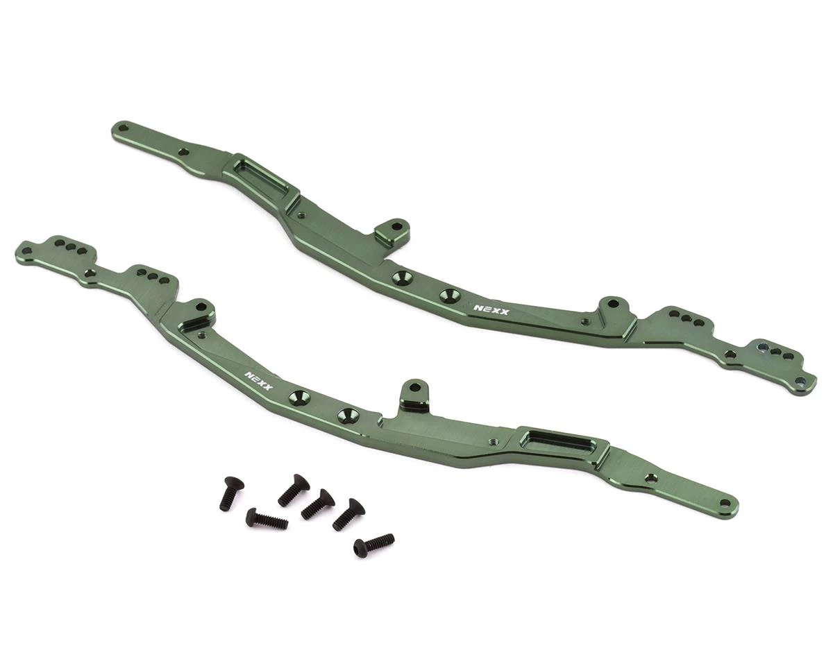 NEXX Racing Kyosho Mini-Z 4X4 Jimmy CNC Aluminum Chassis Rails. These optional aluminum chassis rails are intended for the Kyosho Mini-Z 4X4 Jimmy. Using these rails will allow for a weight reduction of over 35% when compared to the stock steel rails. Package includes two green frame rails.