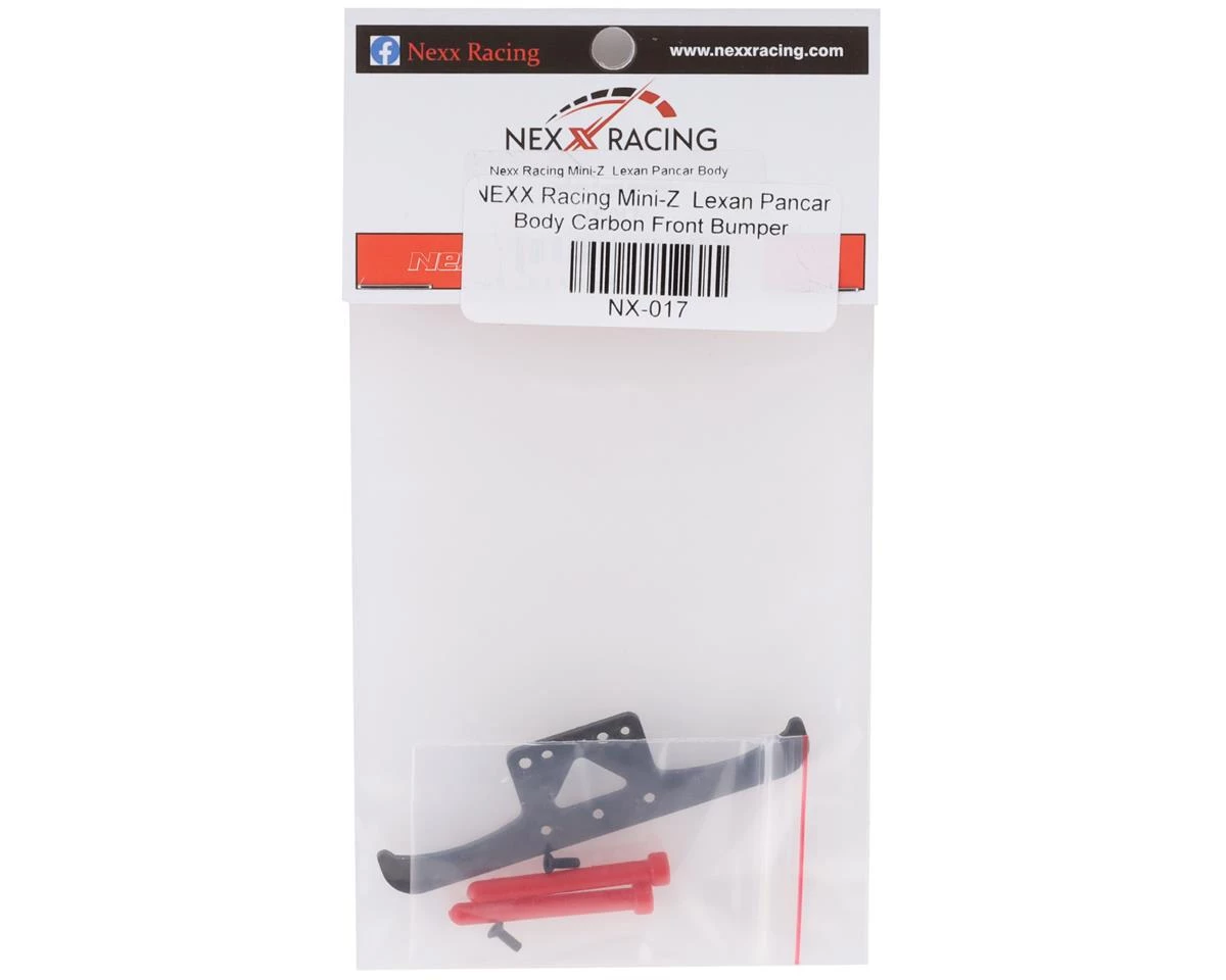 An optional upgraded NEXX Racing Lexan Pancar Carbon Fiber Bumper for use with the Mini-Z family of vehicles when using a lexan style pancar body. Includes two body posts, and mounting hardware.